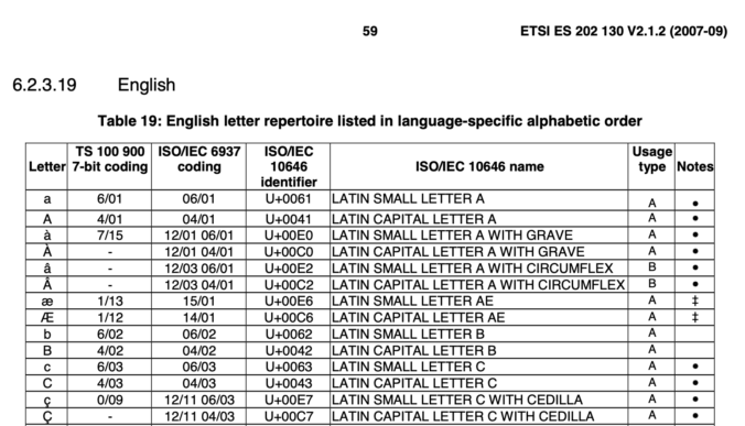 Aber die Betonung liegt auf “eigentlich”. Der Europäische Standard ETSI ES 202130 “Character repertoires, orderings and assignments to the 12-key telephone keypad (for European languages and other languages used in Europe)” (kann man bei ETSI kostenlos herunterladen), listet für über 100 in Europa gesprochene Sprachen den nötigen Zeichenvorrat und die Sortierreihenfolge.
